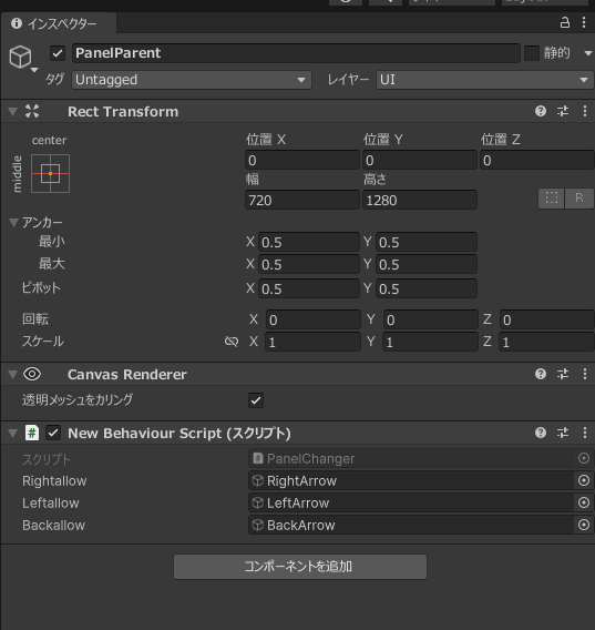 インスペクターは何かオブジェクトを作成したときに、そのオブジェクトが持つコンポーネントがずらりと並ぶウインドウのことです。