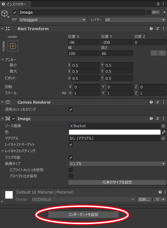 「●●に触ったら」の●●(オブジェクト)を選択し、表示されたインスペクターパネルの一番下の方にある「コンポーネントを追加」ボタンを押しましょう。