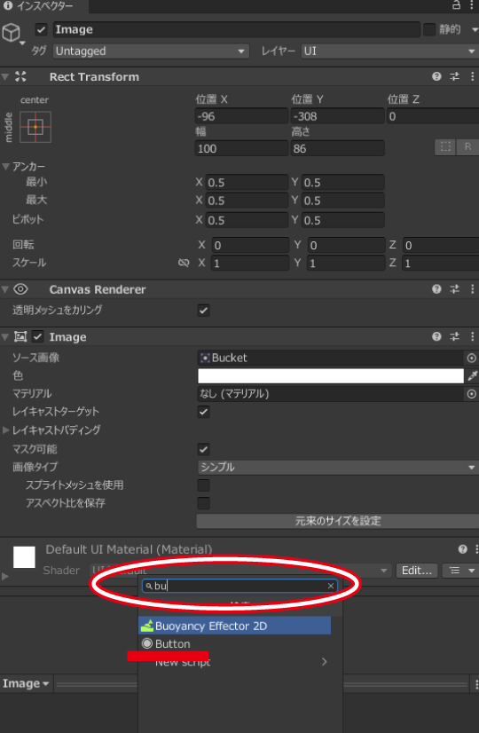 「コンポーネントを追加」ボタンを押すと自動的に検索バーが出てくると思うので、そこでbuと入力しましょう。するとButtonが表示されますのでそれを選択してください。