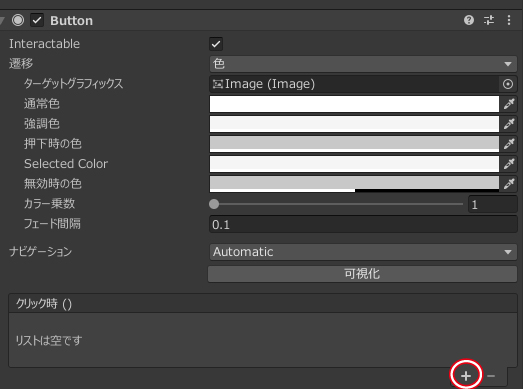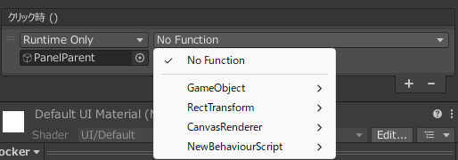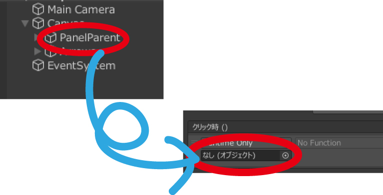 私の場合はこの「PanelParent」というのが、自分がアタッチをしたオブジェクトになります。このオブジェクトをなし(オブジェクト)の欄にドラッグアンドドロップするわけですね。